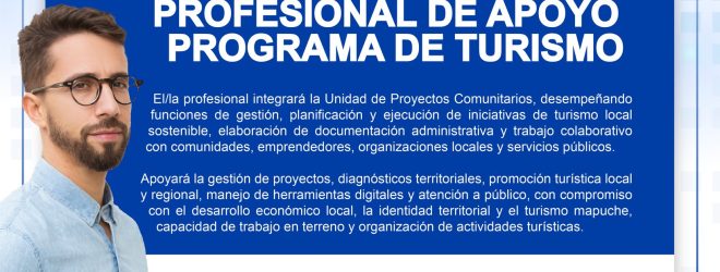 TEODORO SCHMIDT – CONCURSO PÚBLICOLa Municipalidad de Teodoro Schmidt requiere: PROFESIONAL DE APOYO PROGRAMA DE TURISMO Recepción de antecedentes:Hasta el 03 de febrero de 2026 Horario: 08:30 a 14:00 hrs Oficina de Partes del Municipio Calle Balmaceda #410, Teodoro Schmidt Descarga las bases aqui https://qrcd.org/9fRy#MuniTeodoro #TeodoroSchmidt #ConcursoPúblico #Turismo