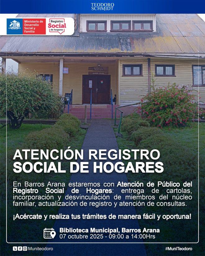 En Barros Arana estaremos con Atención de Público del Registro Social de Hogares: entrega de cartolas 📄, incorporación y desvinculación de miembros del núcleo familiar 👨👩👧👦, actualización de registro 🖊️ y atención de consultas ❓.