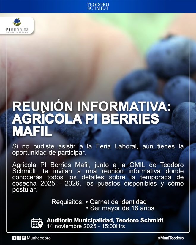 Agrícola PI Berries Mafil, junto a la OMIL de Teodoro Schmidt, te invitan a una reunión informativa donde conocerás todos los detalles sobre la temporada de cosecha 2025 – 2026, los puestos disponibles y cómo postular. 🌱💼