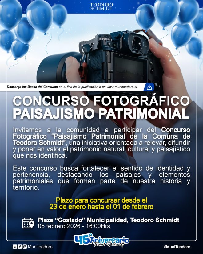 Invitamos a la comunidad a participar del Concurso Fotográfico “Paisajismo Patrimonial de la Comuna de Teodoro Schmidt”, una iniciativa orientada a relevar, difundir y poner en valor el patrimonio natural, cultural y paisajístico que nos identifica