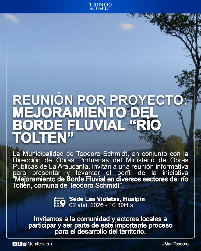 La Municipalidad de Teodoro Schmidt, en conjunto con la Dirección de Obras Portuarias del Ministerio de Obras Públicas de La Araucanía, invitan a una reunión informativa para presentar y levantar el perfil de la iniciativa “Mejoramiento de Borde Fluvial en diversos sectores del río Toltén, comuna de Teodoro Schmidt”.