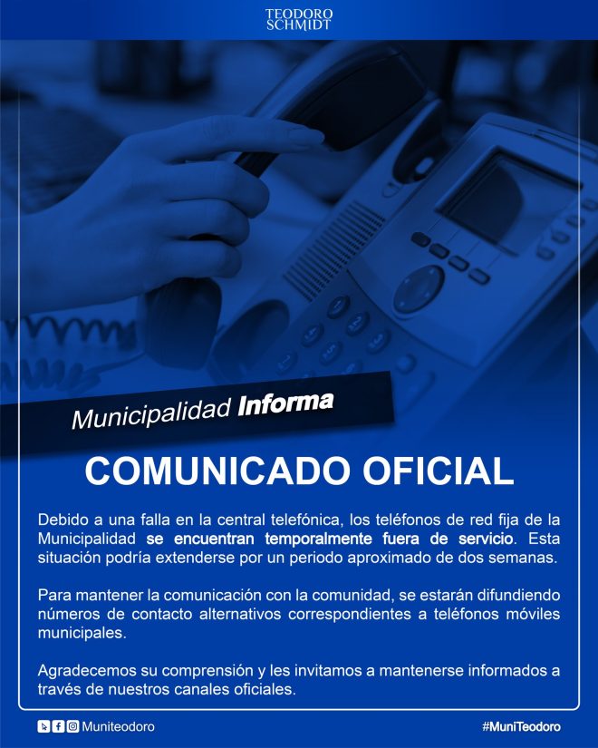 Debido a una falla en la central telefónica, los teléfonos de red fija de la Municipalidad se encuentran temporalmente fuera de servicio ☎️❌. Esta situación podría extenderse por un periodo aproximado de dos semanas.