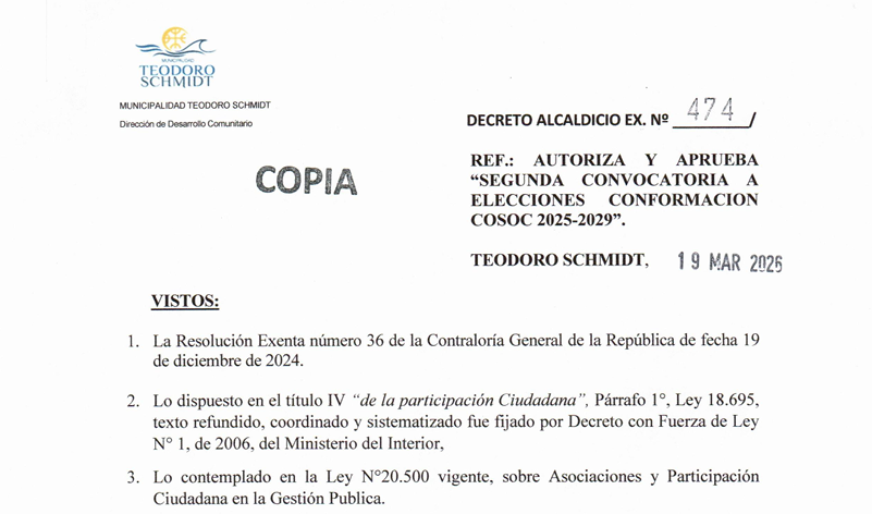 Conforme lo establece la Ley 18695 Orgánica Constitucional de Municipalidades, ART 94 “ En cada Municipalidad existirá un Consejo Comunal de Organizaciones de la Sociedad Civil“, COSOC. Estimados vecinos y vecinas de Teodoro Schmidt, los invitamos a hacer realidad la participación ciudadana, y con ello contribuir al desarrollo y crecimiento de nuestra hermosa comuna Teodoro Schmidt.